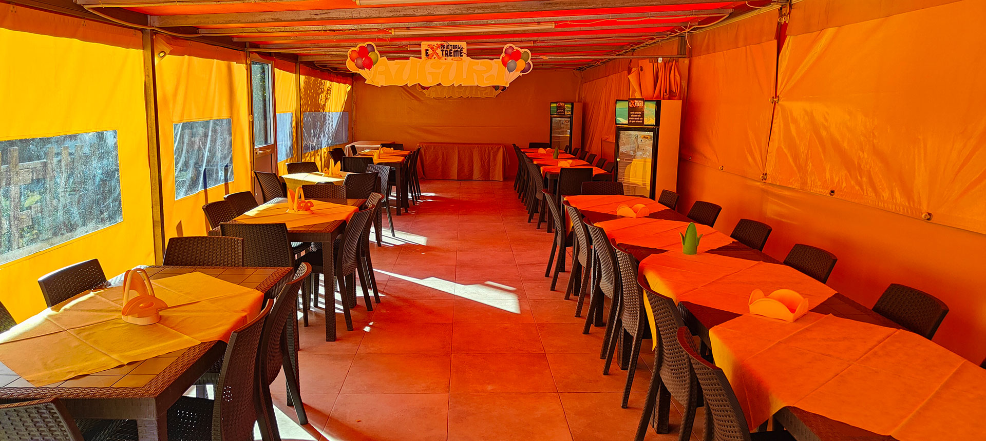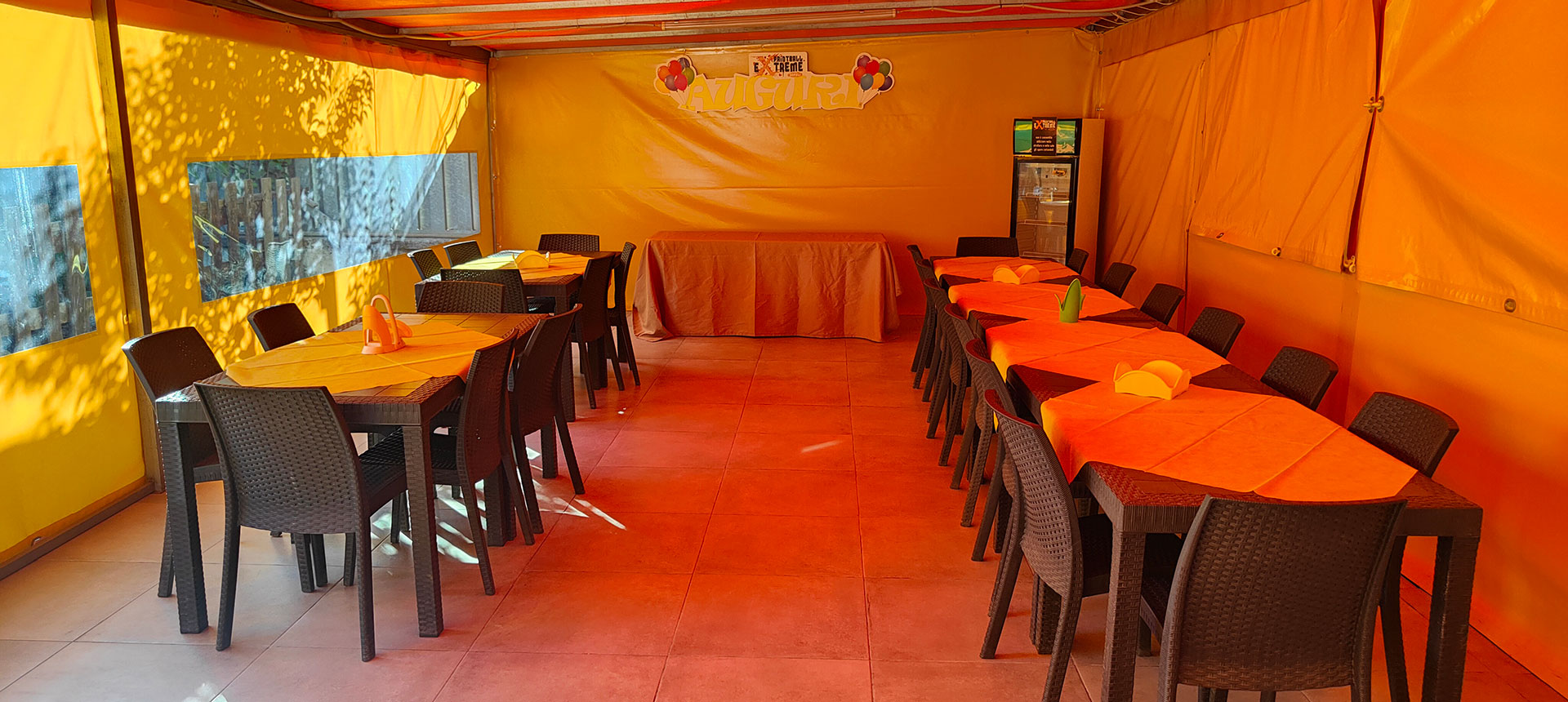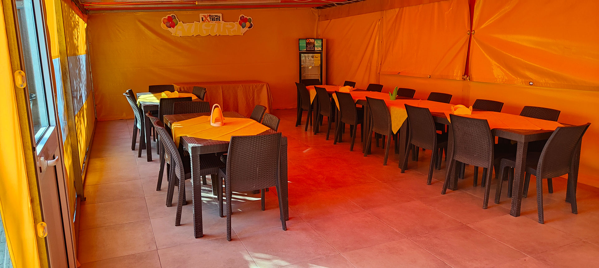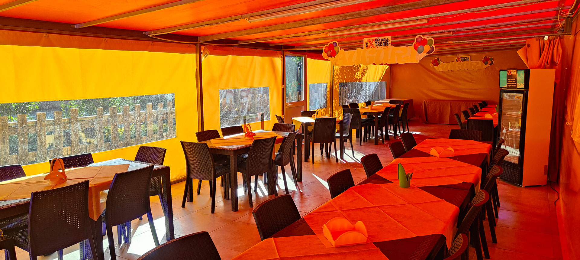 Può ospitare fino ad un massimo di 26 persone, sala chiusa con teli apribili.