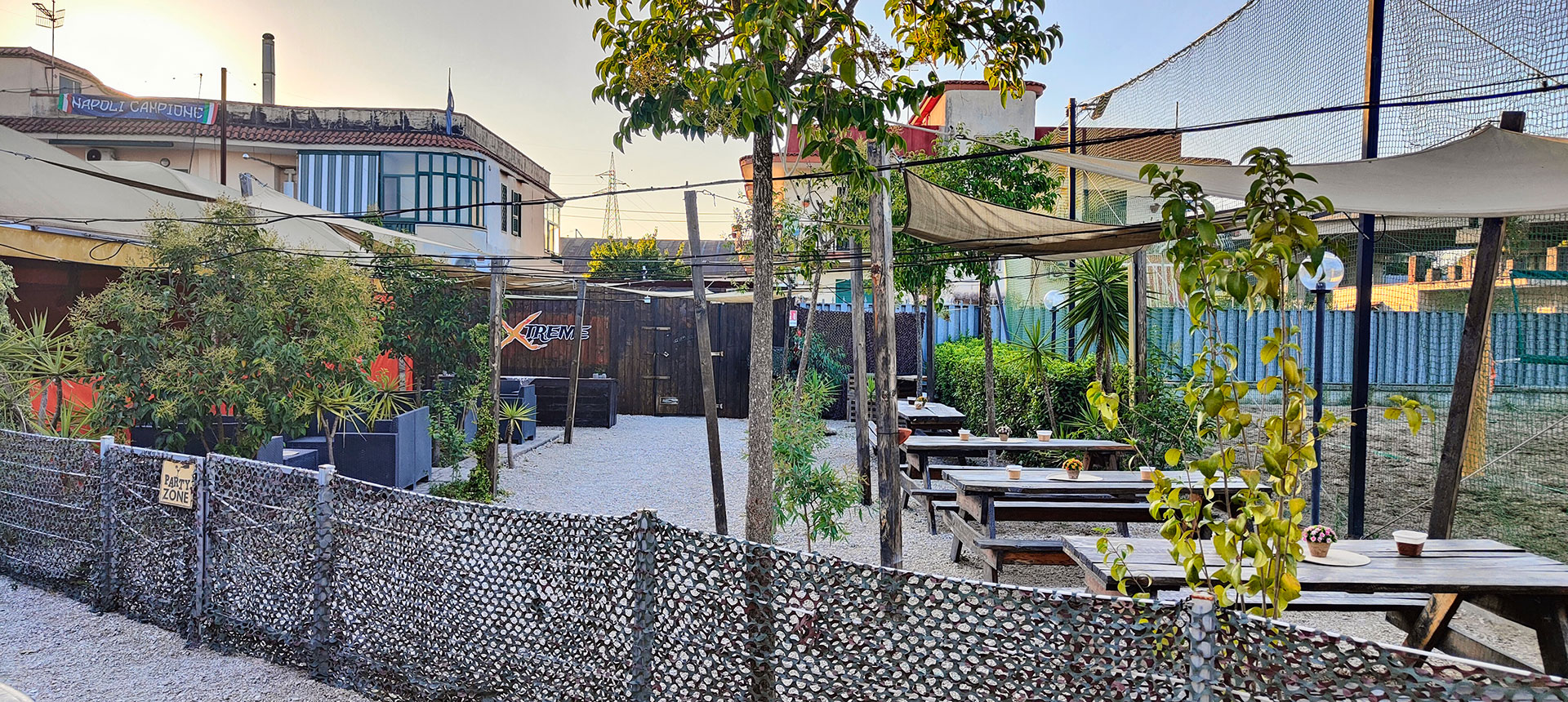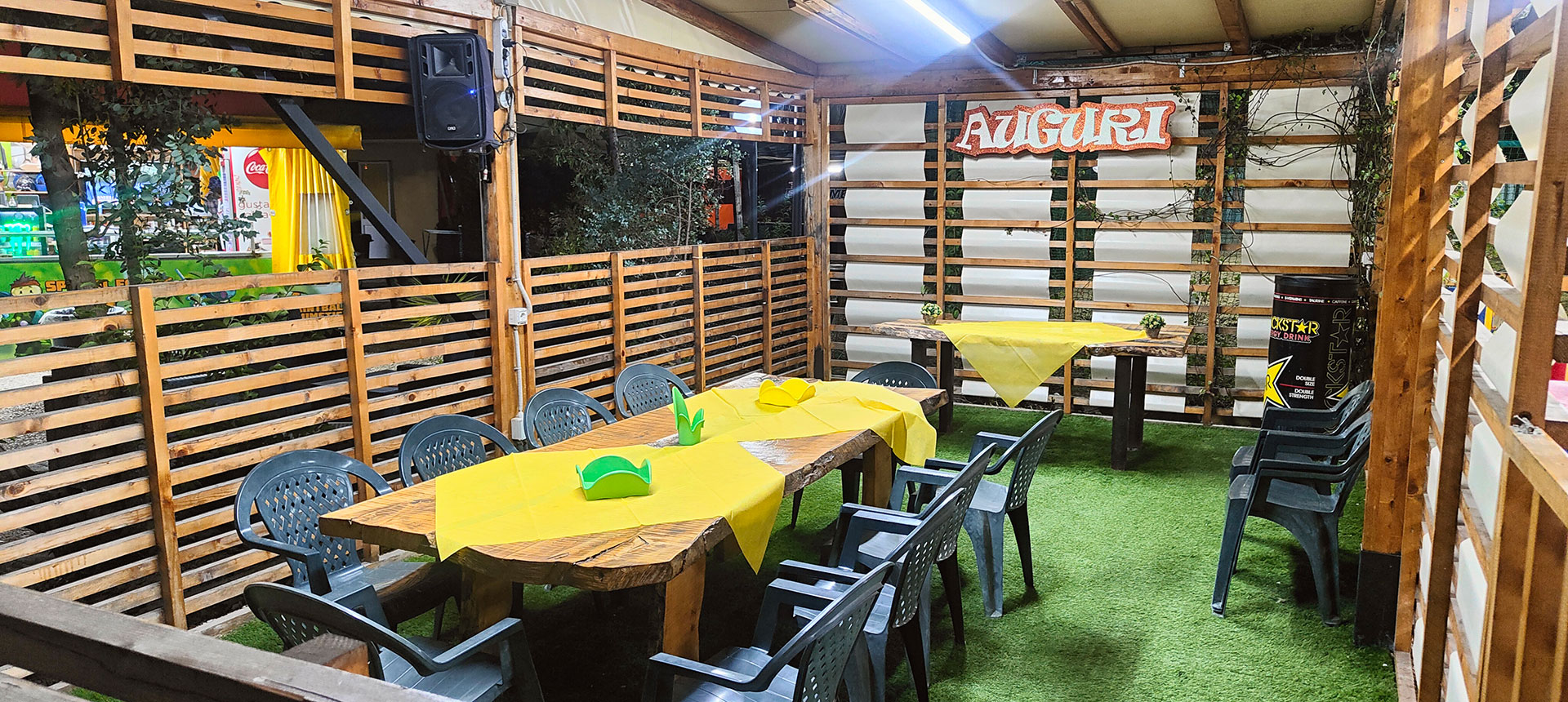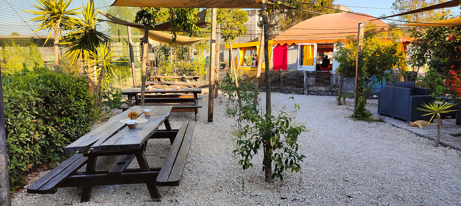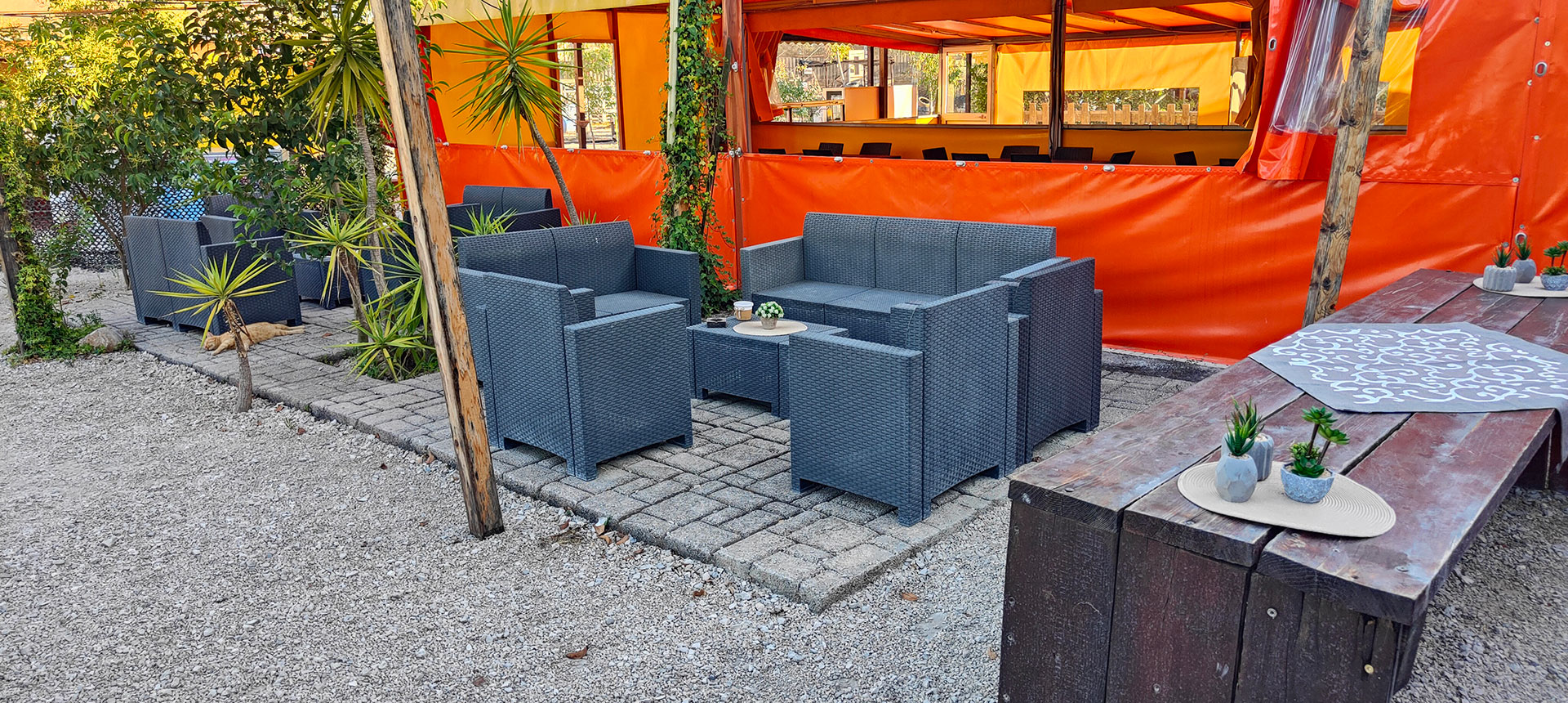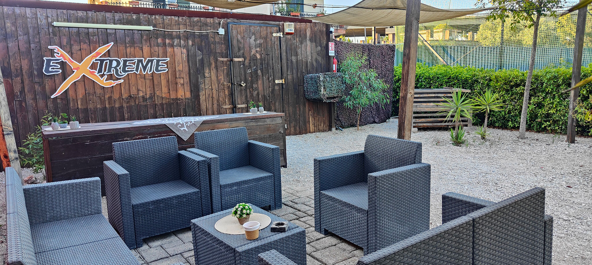 Area riservata all'aperto dove ci sono tavoli e zone relax.